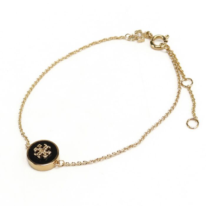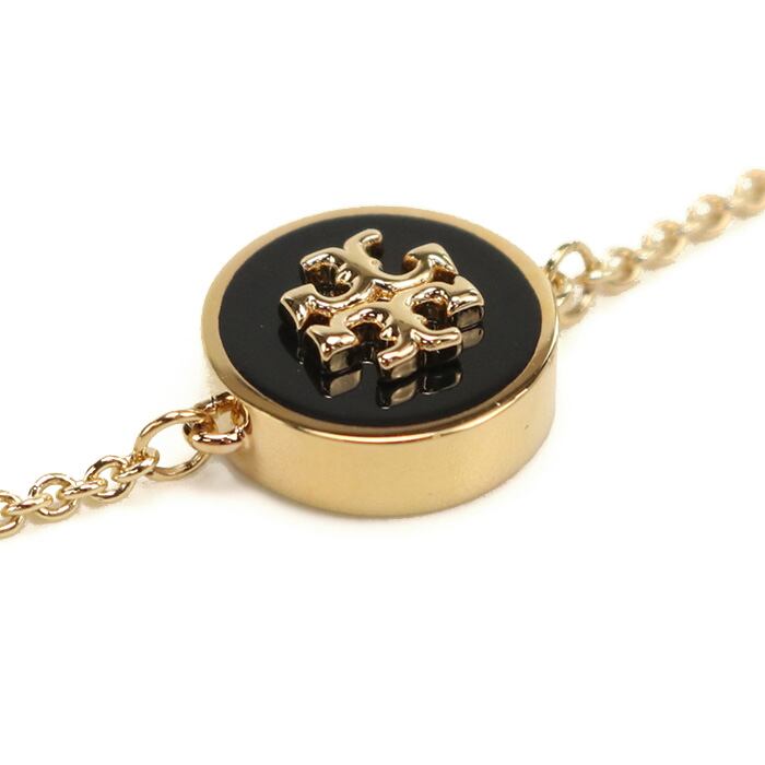 ブラック×ゴールドの洗練された配色が目を引く、Tory Burchロゴチャーム付きブレスレット。華奢なチェーンが手元に繊細な輝きを添え、中央のラウンドチャームが上品なアクセントに。