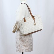 MICHAEL KORS(マイケルコース)の上品なトートバッグ。ブランドを象徴するMKモノグラム柄が全面に施され、ベージュ×ブラウンの配色が落ち着いた印象を与えます。ゴールドのロゴチャームと金具が高級感を演出し、通勤やお出かけにもぴったりのアイテムです。