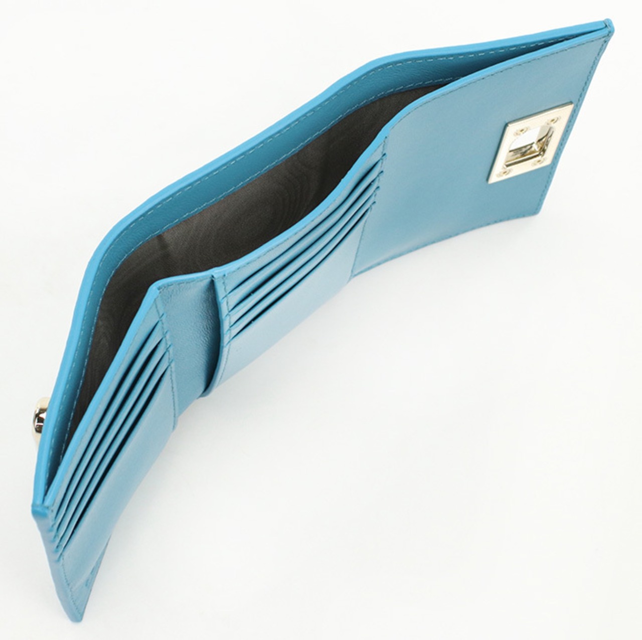 この財布は、美しいブルーのカラーが特徴で、シンプルながらも洗練された印象を与えます。高品質なレザー素材を使用し、持ち運びにも便利なサイズ感が魅力です。背面には小銭入れが付いており、使い勝手も抜群。特別な日から普段使いまで幅広くご活用いただけます。